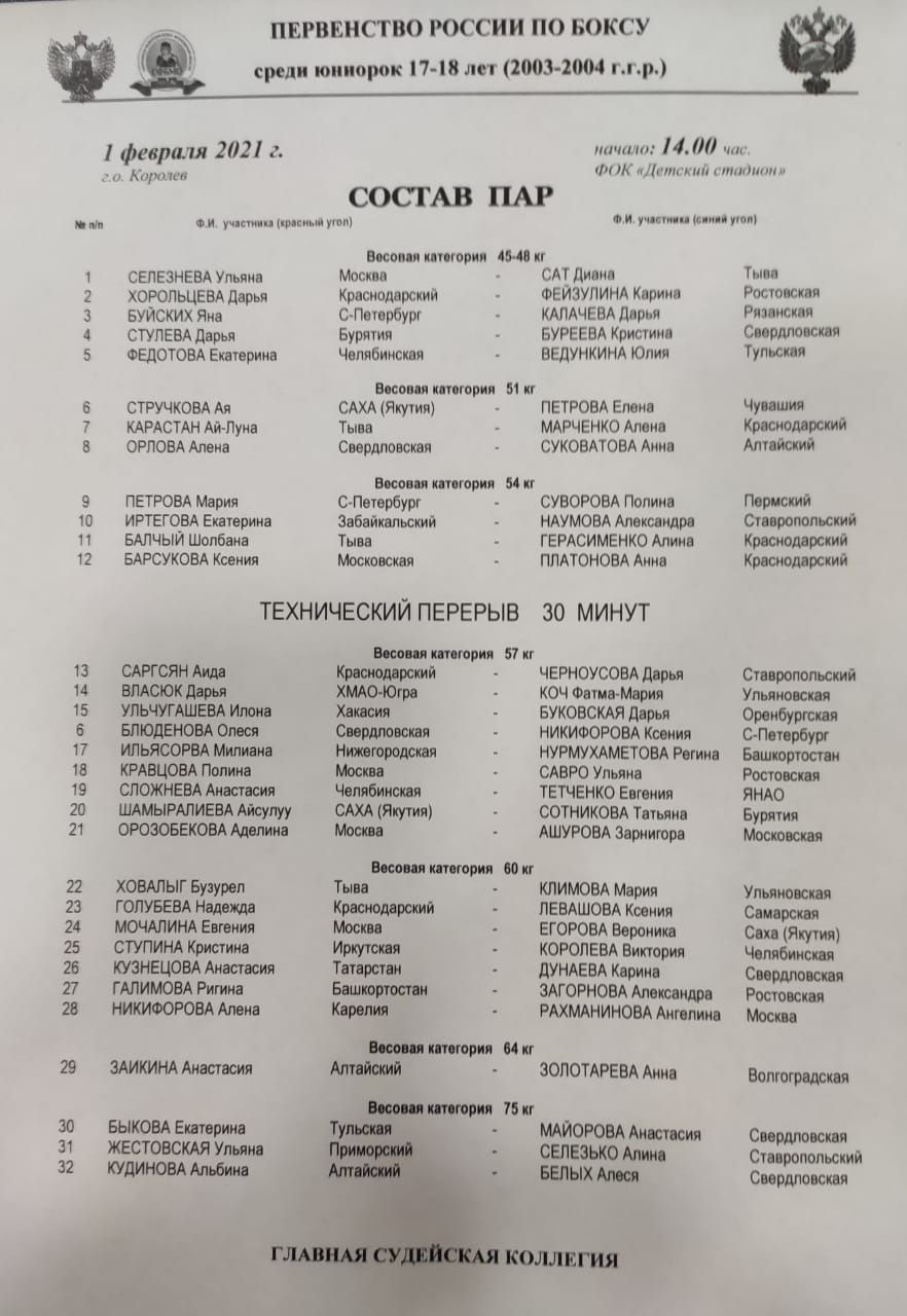 В понедельник, 1 февраля, в подмосковном Королёве стартует первенство России по боксу среди юниорок 2003-2004 годов рождения. Соревнования начнутся в 14:00 в физкультурно-оздоровительном комплексе «Детский стадион», который на ближайшую неделю станет ареной для поединков по боксу среди сильнейших спортсменок страны этого возраста. Всего в соревнованиях в Королёве примут участие 168 спортсменок из 52 регионов страны. Они выявят лучших в 10 весовых категориях.