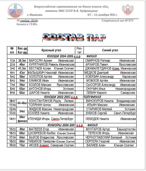 Главная / Архив новостей / ПРЯМАЯ ТРАНСЛЯЦИЯ: Всероссийские соревнования по боксу класса "Б" памяти ЗМС СССР В.В. Кудрявцева. г. Иваново. День 3-й