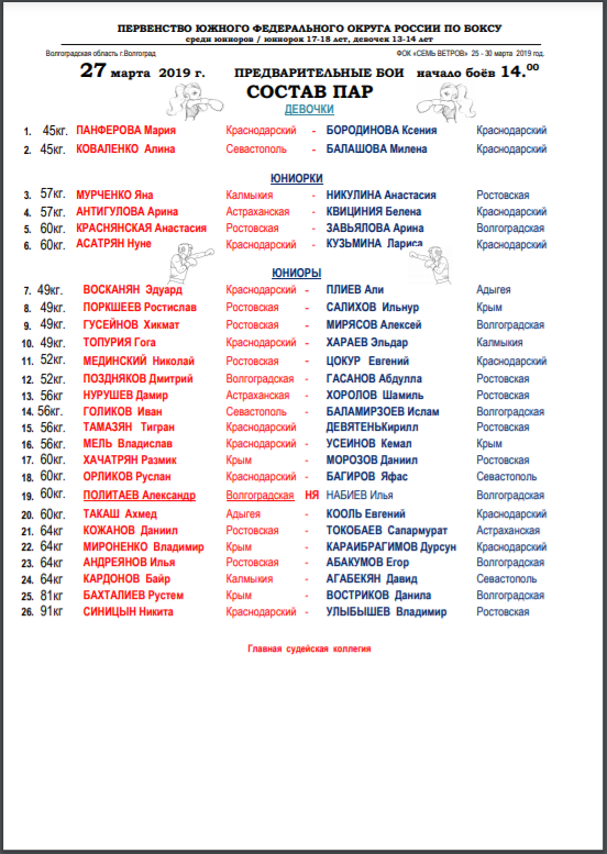 Главная / Архив новостей / Первенство ЮФО по боксу среди юниоров, юниорок и девочек. г. Волгоград. День 2-й