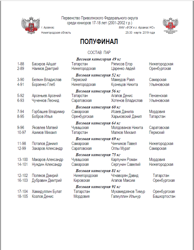 Первенство ПФО среди юниоров 17-18 лет. Арзамас. ПОЛУФИНАЛЫ