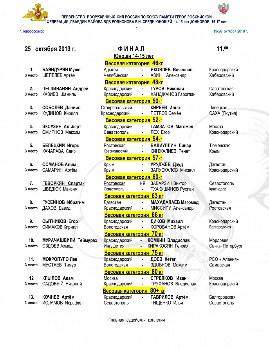 Первенство Вооруженных Сил Российской Федерации по боксу среди юниоров 16-17 лет и юношей 14-15 лет. Новороссийск. День 5