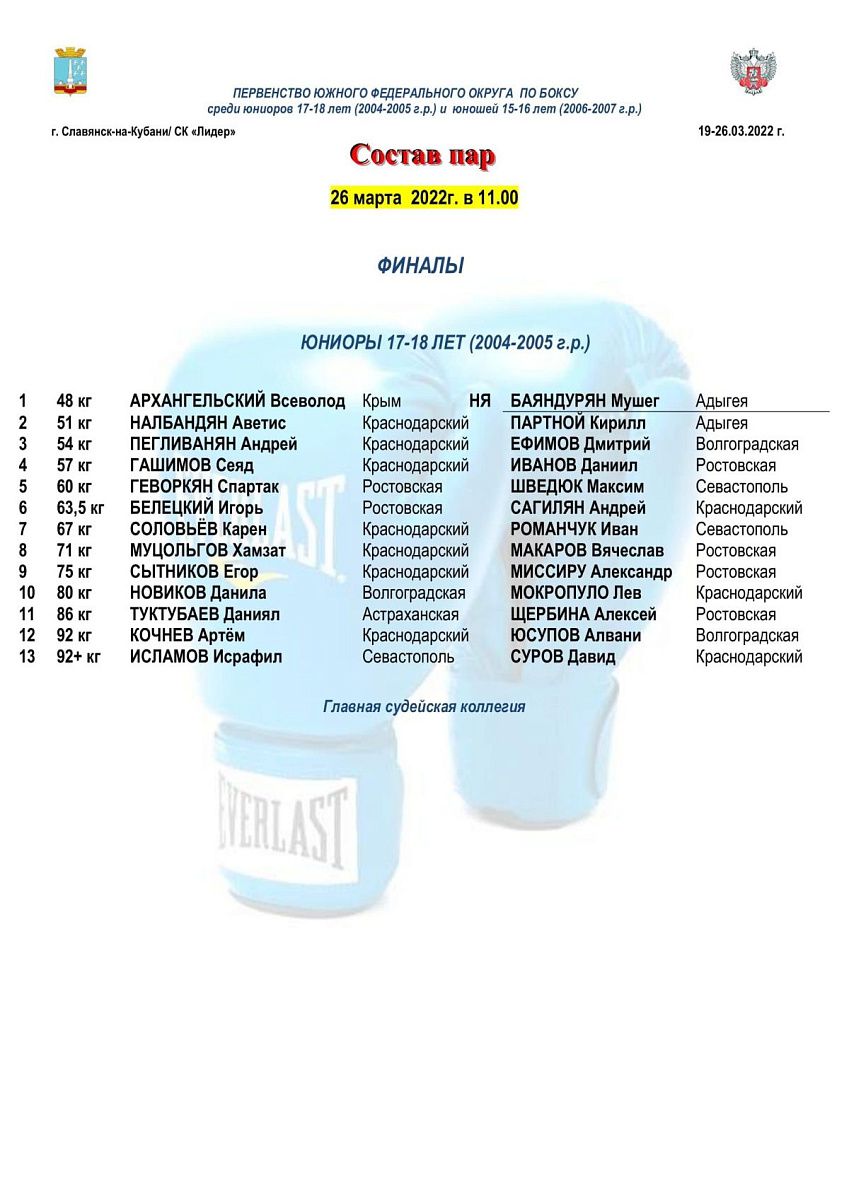Первенство ЮФО по боксу среди юношей 15-16 лет и юниоров 17-18 лет. Славянск-на-Кубани. ФИНАЛЫ